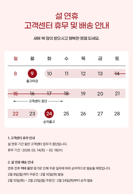 2026년 설 연휴를 맞아 고객센터 운영 및 배송 일정을 안내드립니다. 이용에 참고 부탁드립니다.